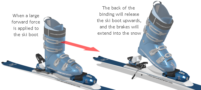 The brakes are the two arms towards the back of the binding that stick into the snow when there is no boot in the binding. The brakes stop the skis from sliding away when they are left on the snow, and stop the skis from sliding too far if you crash and your skis release, although in some snow conditions this doesn't always work as effectively as it could. When you put your foot into the binding, the boot presses down on the brake pedal which lifts the brakes out of the snow, and tucks them in under the ski boot so that they are out of the way while skiing. The brakes stay in this position as long as the boot is in the binding, but as soon as the boot is released, the brakes spring back into their extended position.