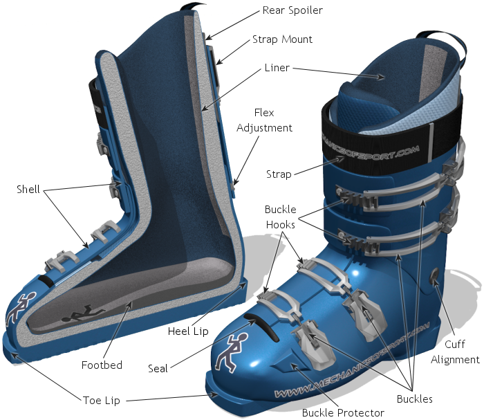 Buckles are the latches that hold your ski boots closed, and determine how tight your boots are. Traditionally ski boots have 4 buckles, 2 over the foot, and 2 around the shin, which many of today's ski boots still have. It is becoming more and more common however for boots intended more for hiking, freestyle, or comfort to have only 3 or even 2 buckles.