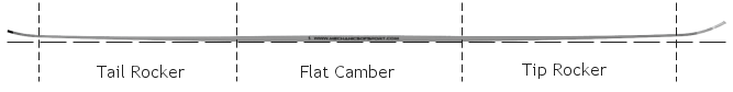 A full rocker ski has a flat camber in the middle of the ski, with a tip and tail rocker at the ends. This shape makes the ski very good at floating in powder, whether skiing forwards or backwards, but due to the flat camber section, does not provide so much grip on hard packed snow. The length and height of the tip and tail rockers can also vary making a ski more or less powder specific, or better at skiing forwards or in both directions when in powder.
