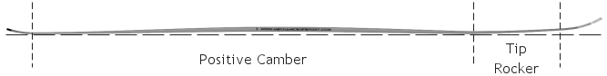 By putting sections of the different camber types above together, different camber shapes can be created which are suited to different skiing preferences. The characteristics of each camber shape can vary largely though, as changing the length and height of the different camber areas used in each shape can make large differences. Below the main camber shapes are listed and described.