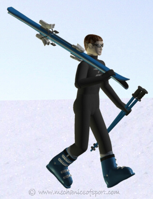 When carrying skis like this please be careful not to hit anyone or anything with the skis. Do not swing the skis around while you walk, and be aware of the back of the skis when you go around corners. With the added difficulty of walking in ski boots, and through snow, extra care needs to be taken while carrying skis.