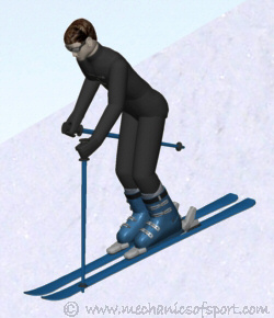 The animation shows the 3D skier doing 2 turns with pole planting on the virtual ski area. On the first turn you see the pole plant from in front, notice how the pole plant happens before the skier points straight down the slope. On the second turn you see the pole plant from the side, notice that the pole plant is made just as the skis become flat to the snow.