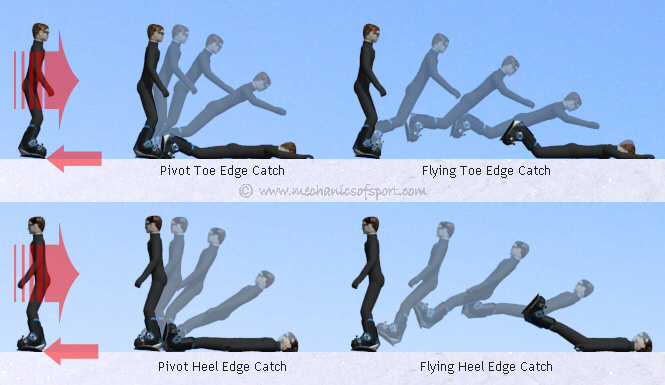 The basic concept of catching an edge is the same as tripping over something. The edge is stuck in the snow, but the body's momentum continues to push the snowboarder forwards. The body continues to move forwards but the caught edge anchors the body, making the body rotate downwards, and throwing the snowboarder at the ground, so that they land roughly flat on the snow. There is more than one type of edge catch however, and exactly what happens depends on the speed, height and position of the snowboarder.