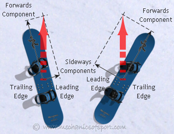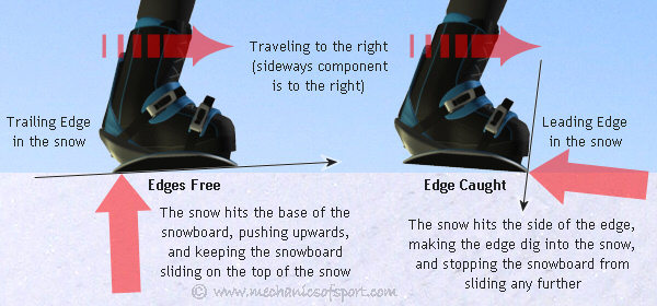 The snow should go under the base of the snowboard before it meets an edge, this makes the snowboard try to travel in the direction of the bottom of the base, and stay on top the snow. If the snow hits an edge before it meets the base, the snow exerts a force on the outside of the edge, which pushes the snowboard into the snow, and stops the board from sliding. This is what happens when an edge catches, stopping the snowboard from sliding any further, and tripping the snowboarder up.