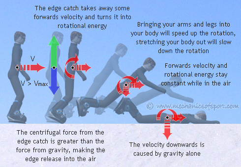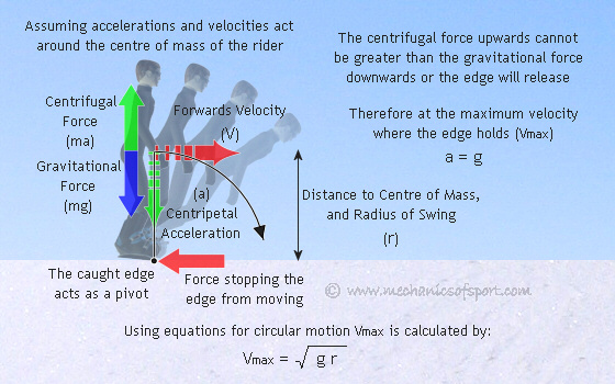 From the diagram below you can see that if the centrifugal force created is greater than gravity the edge will release upwards almost instantly and the snowboarder will come into the air. The maximum sideways velocity at which the edge stays in the snow (Vmax) can be worked out. Then Vmax can be used to find out the worst case scenario for this type of edge catch.
