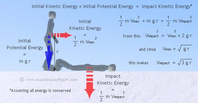 Now the maximum entrance velocity for a pivot edge catch is known, lets work out the impact velocities that it creates. To do this the assumption that all energy is conserved during the crash is made, which means that the initial kinetic and potential energy, will both be kinetic energy at impact. This assumption also means that there is no wind resistance, that the edge will stay in the snow all the way until impact (in real life the toes or heels will push it out of the snow a few degrees earlier), and that the centre of mass will go all the way to level with the snow (again not quite true). From this the impact velocity of the centre of mass (Vimpact) can be calculated.