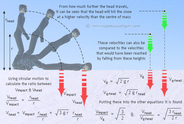 The snowboarder's head has to travel further to hit the snow than their centre of mass does, yet they still hit the snow at the same time. This means that the head will be going faster than the centre of mass when it hits the snow. By using using the distances from the snow to the centre of mass and the head, how much faster the head will be traveling can be calculated.