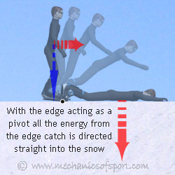 The Pivot Edge Catch happens when you are going a bit faster than the slow edge catch, and when the edge catches you are not so much sent off balance, but suddenly thrown forwards or backwards. This takes your body away from over the edge too quickly to recover by sitting or kneeling down, and instead the caught edge acts like a pivot throwing your body at the snow.