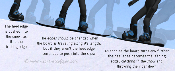 If like in a turn situation, the direction the snowboard changes so that the leading and trailing edges swap, but the edge that is pushing into the snow isn't changed, the trailing edge that is pushing into the snow will become the leading edge and catch. This happens through a mixture of rider error and bad observance, as changing the direction of the snowboard is what makes the edge catch possible, and unobservance to change the edge at the right time is what allows the edge catch to happen. Beginners can find changing the edge at the right time a bit difficult, it does take some practice to be able to know exactly when to change the edge.