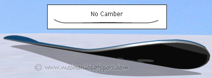 This is similar to negative camber but instead of its shape pushing the edges away from the snow, the board will just lie completely flat on a flat surface. This shape means that although the edges will touch the snow along their length, they will not have that extra force trying to keep them there that a traditional camber provides. This makes a board that has more edge hold than a rocker board but less than a traditional camber board. This shape is currently being used on freestyle, and more powder orientated snowboards. For powder snowboards the flat section often lasts most of the board but with larger rocker shaped tips on the ends.